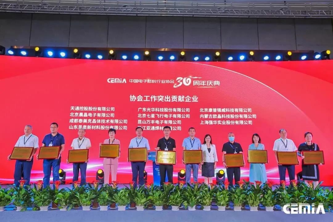 大會同期舉行了“中國電子材料行業協會成立30周年慶典活動”,我公司榮獲“協會工作突出貢獻企業”稱號。